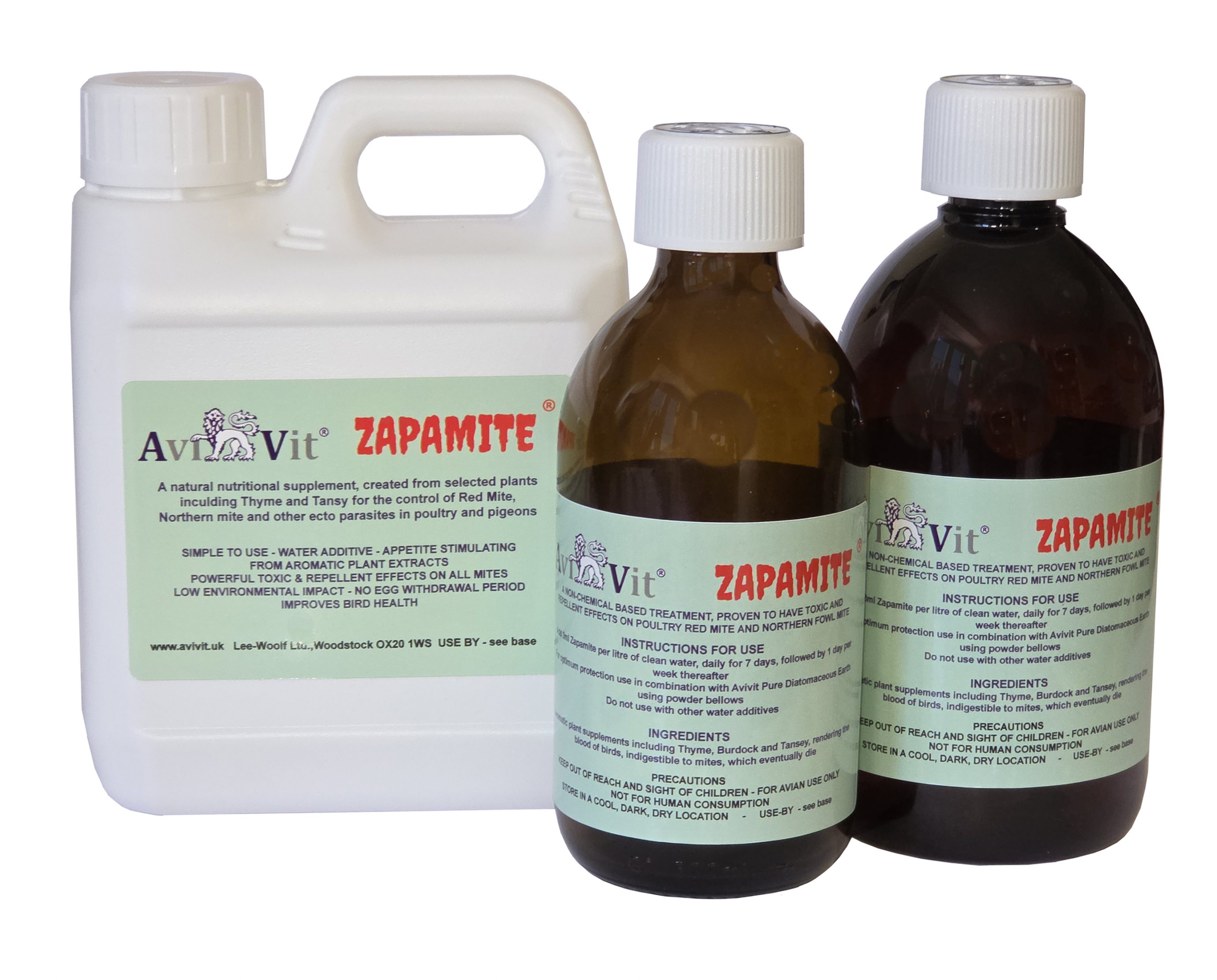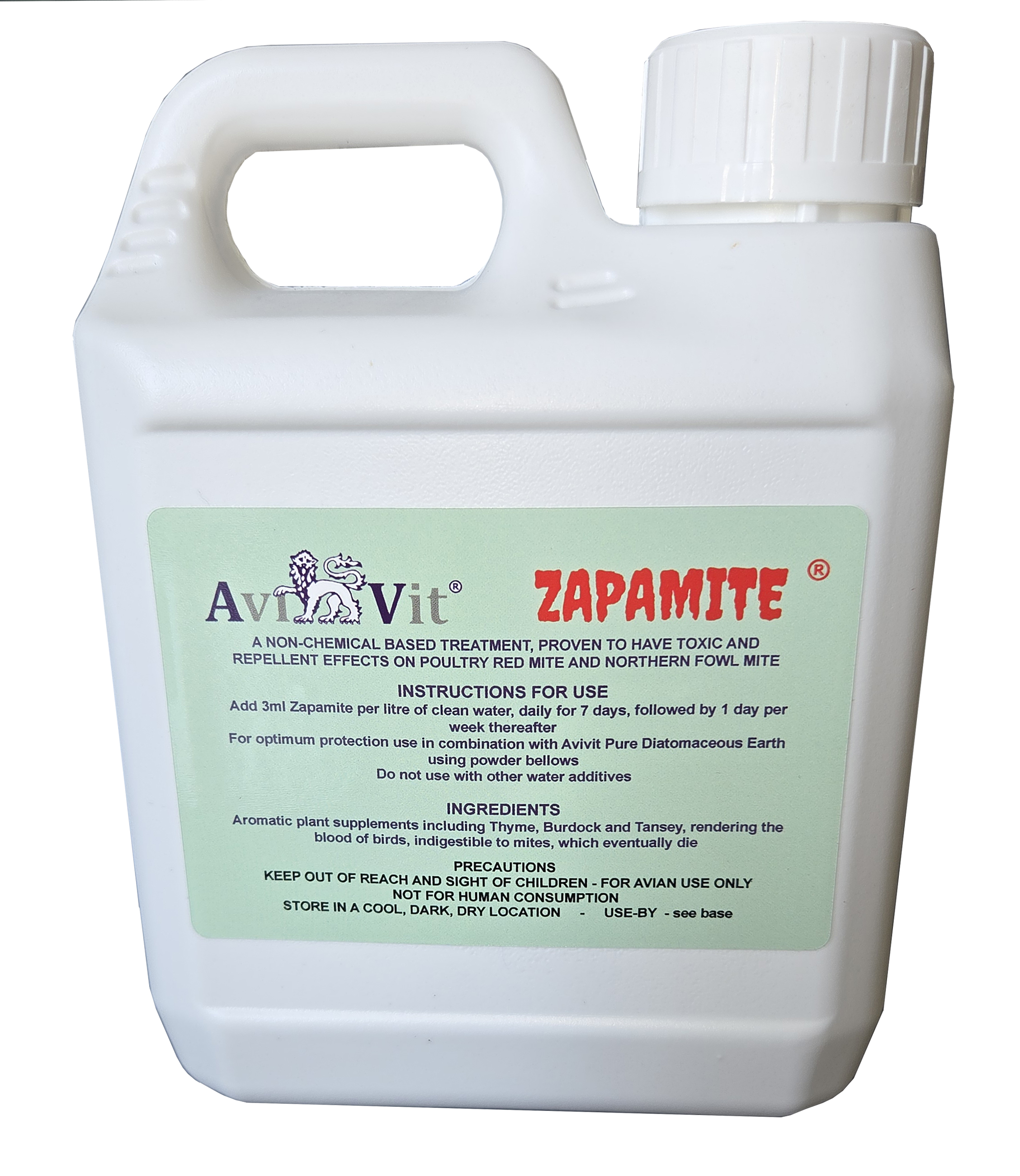 A non chemical based treatment proven to have toxic and repellent effects on poultry Red Mite, Northern Fowl mite and other ecto -parasites in poultry and pigeons. Zapamite treatment works by breaking the breeding cycle. Once the bird has consumed water, the mites go for their blood meal, the mites are unable to digest the Zapamite and will begin to dry from the inside out. Results will be visible between 6 to 8 weeks after starting the treatment.